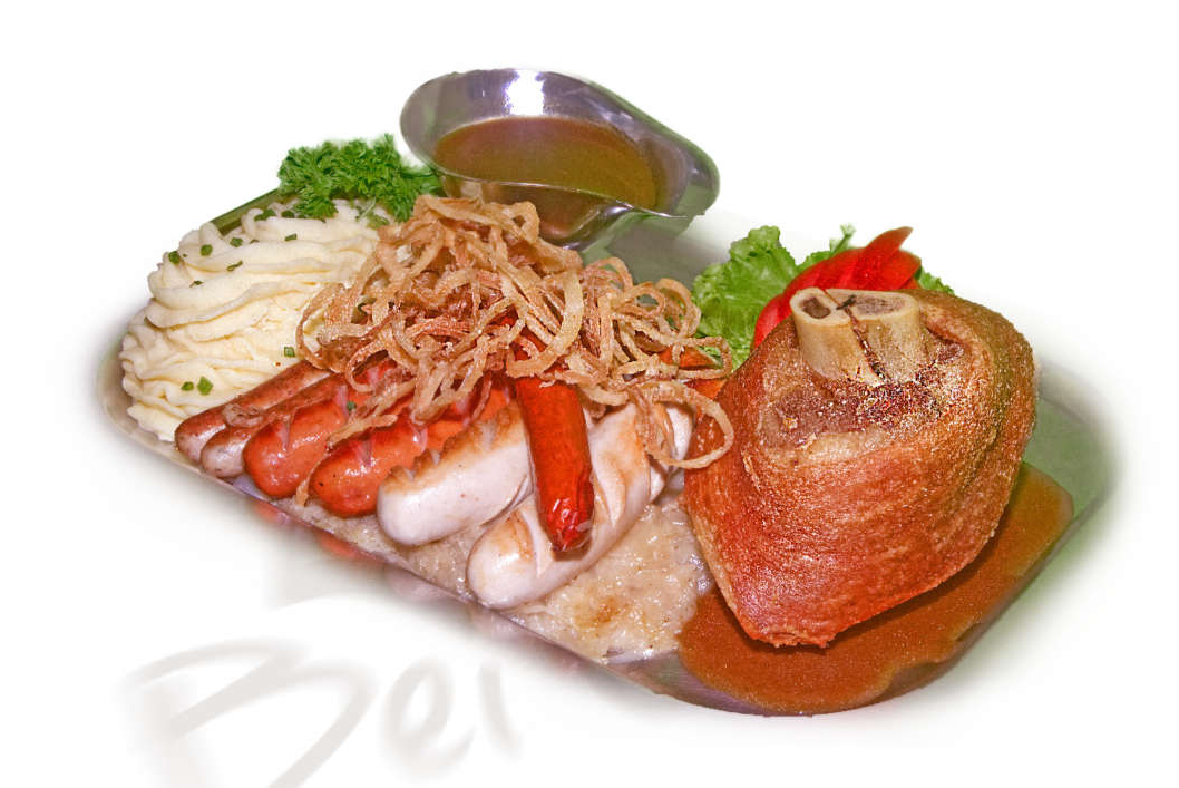 mit knuspriger Schweinshaxe, gegrillten Nürnberger, Schweins und Rinderbratwürste dazu Sauerkraut, Röstzwiebeln, Semmelknödel, Kartoffelpüree und Bratensoβe