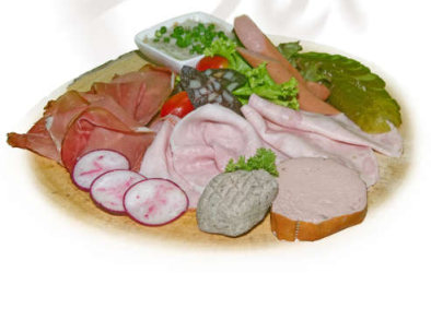 Schwarzwälder Schinken, Bauernschinken, Bierschinken, Blut- und Leberwurst Pfälzer Art, feine Hausmacher Leberwurst, Bierknacker, Griebenschmalz, Radieschen, sauren Gurken, hausgebackenes Brot und Butter