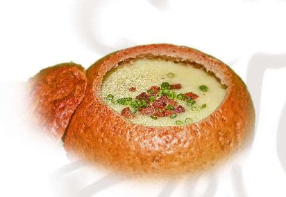 with crispy diced bacon, served in a bread bowl