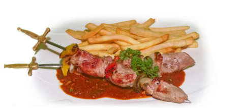 am Spieß gegrillte Schweinefiletmedaillons mit Paprika und Zwiebeln auf pikanter Paprikasoße und Pommes frites